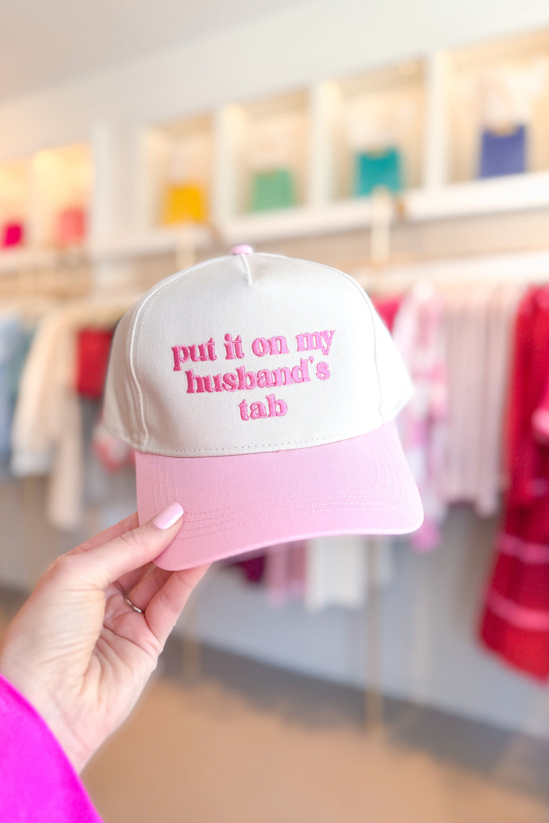 Put It On My Husbands Tab Embroidered Trucker Hat - Baby Pink