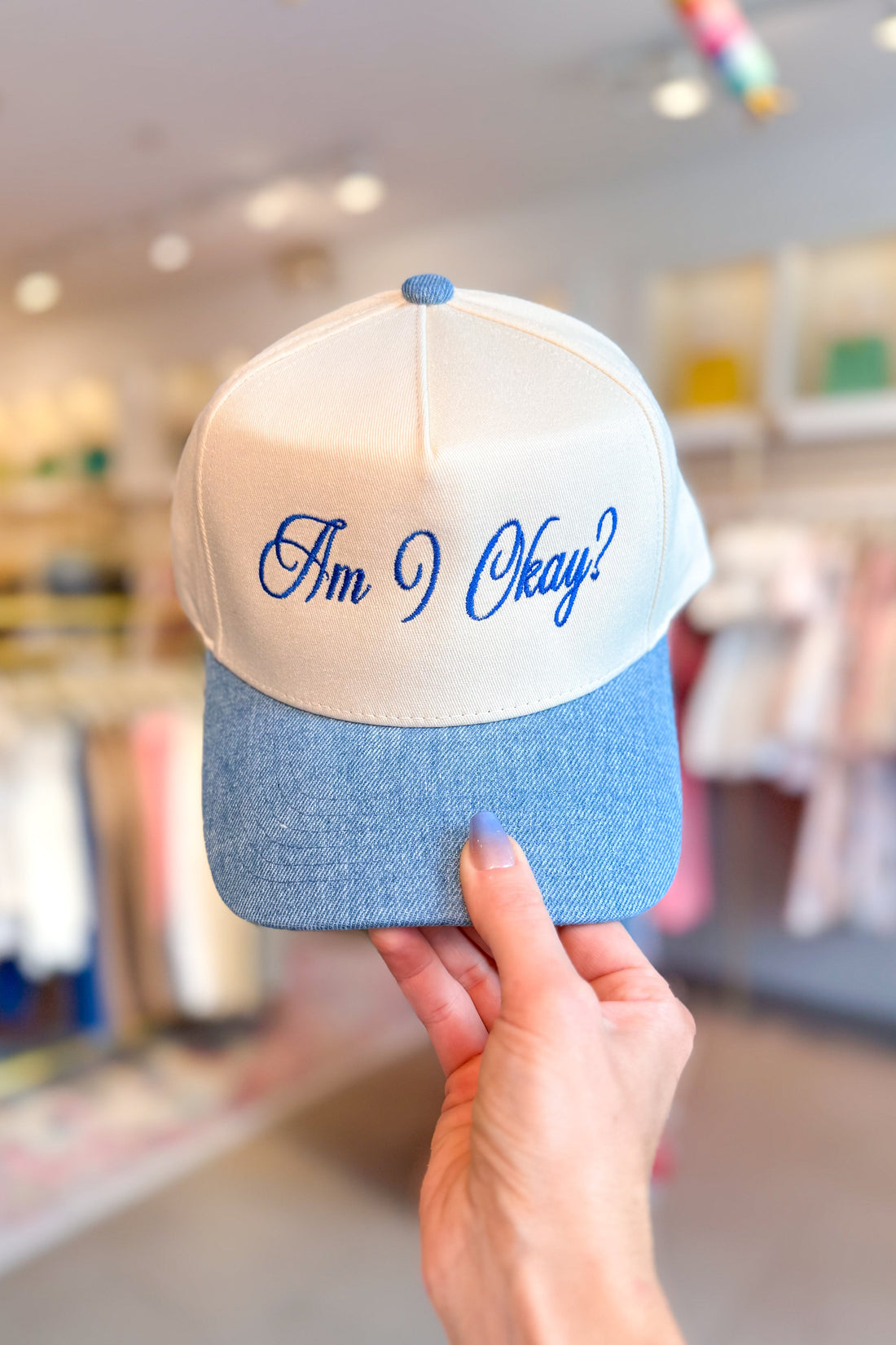 Blue Denim Am I Okay? Embroidered Trucker Hat