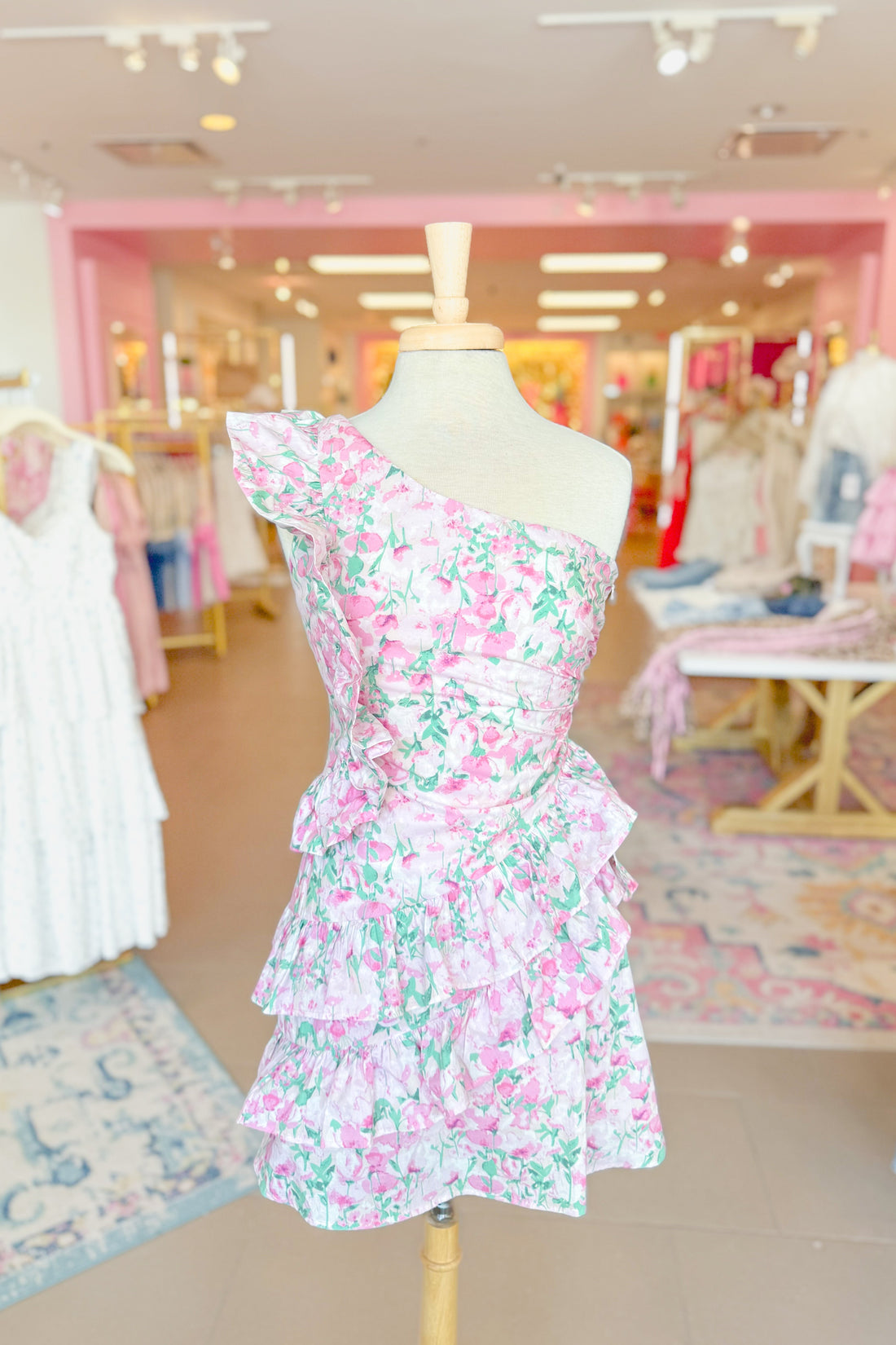 Pink Floral One Shoulder Mini Dress With Ruffles