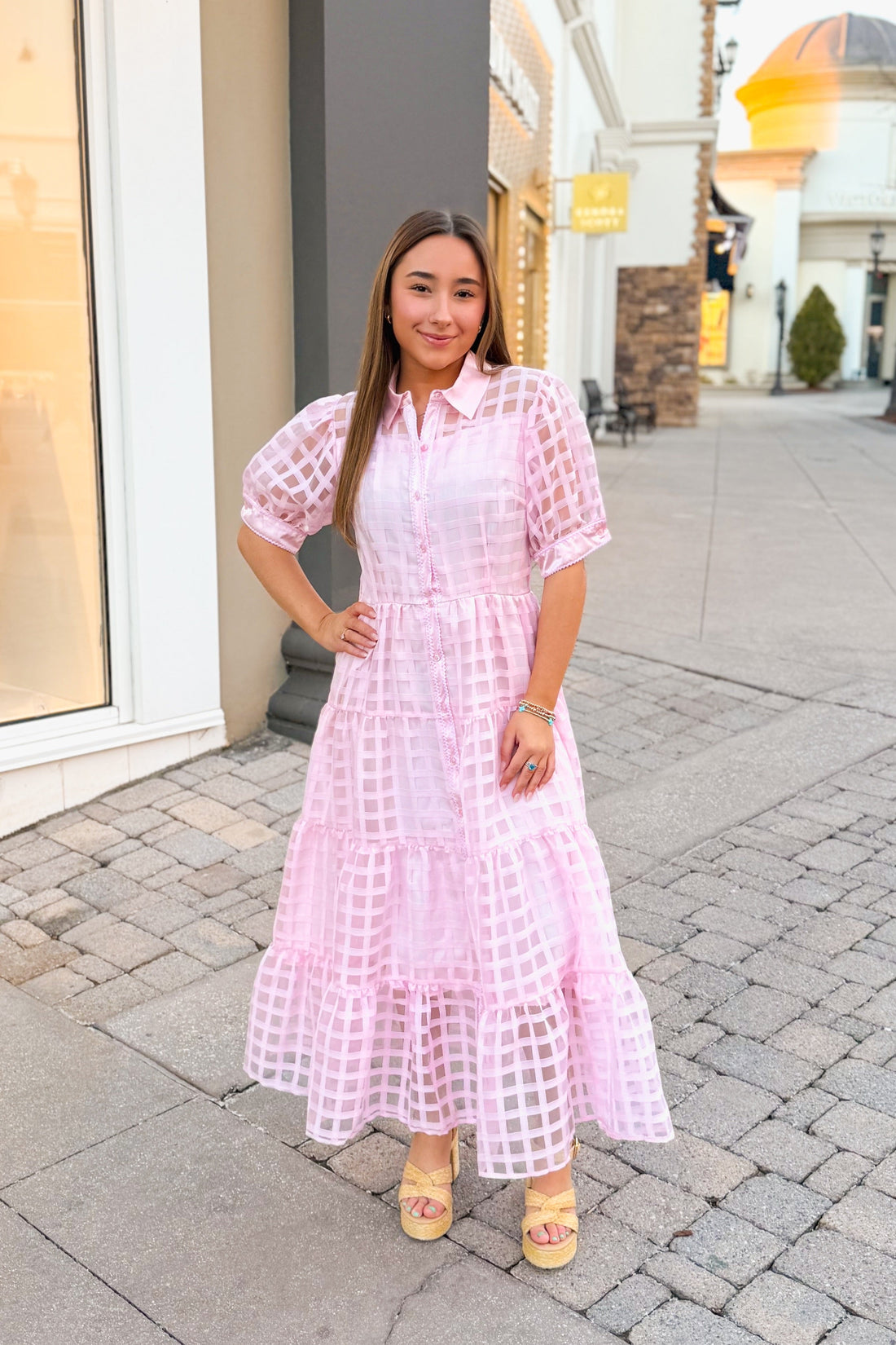 Baby Pink Plaid Sheer Puff Sleeve Midi Dress