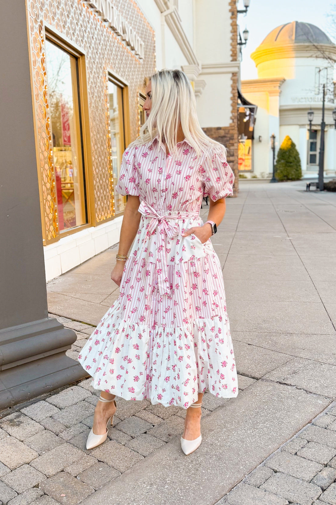 Pink Floral Puff Sleeve Midi Dress