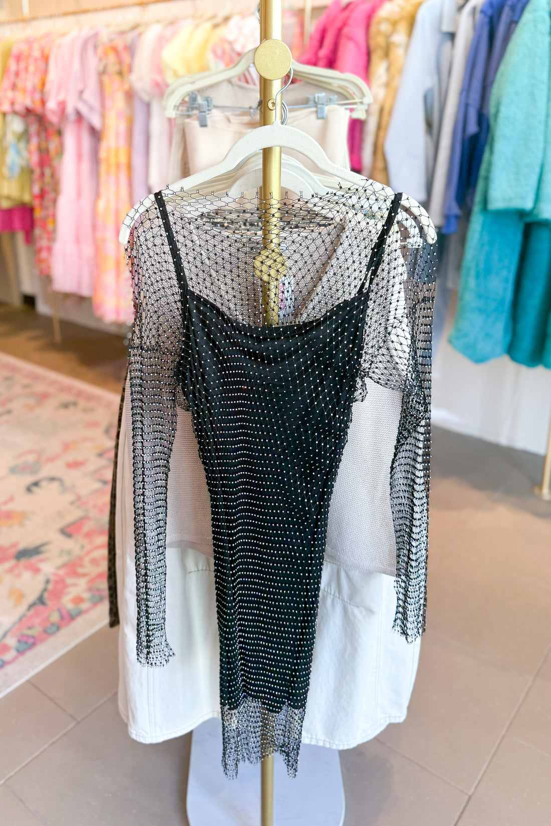 Black Mini Dress With Rhinestone Net Overlay