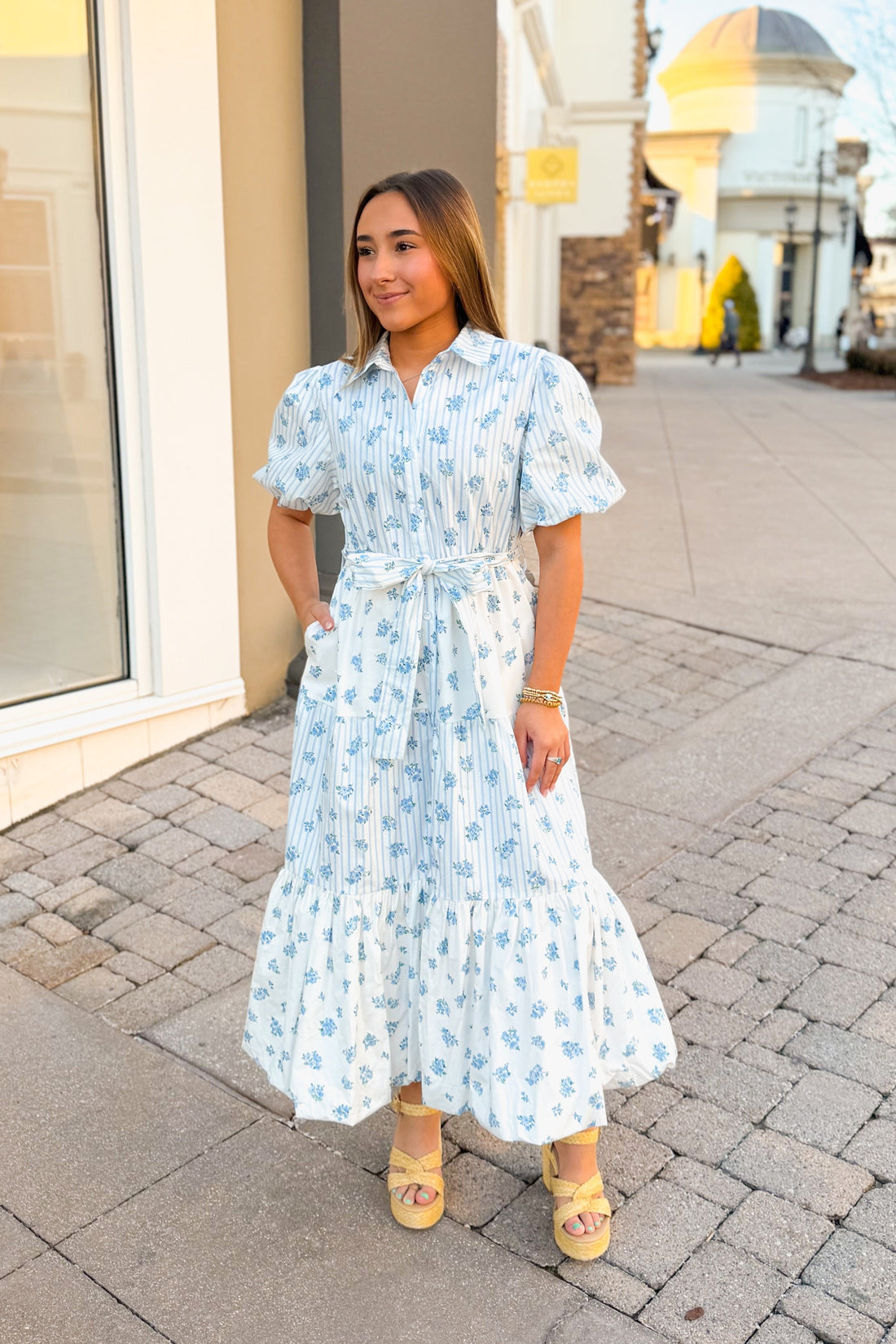 Blue and White Floral Ruffle Midi Dress