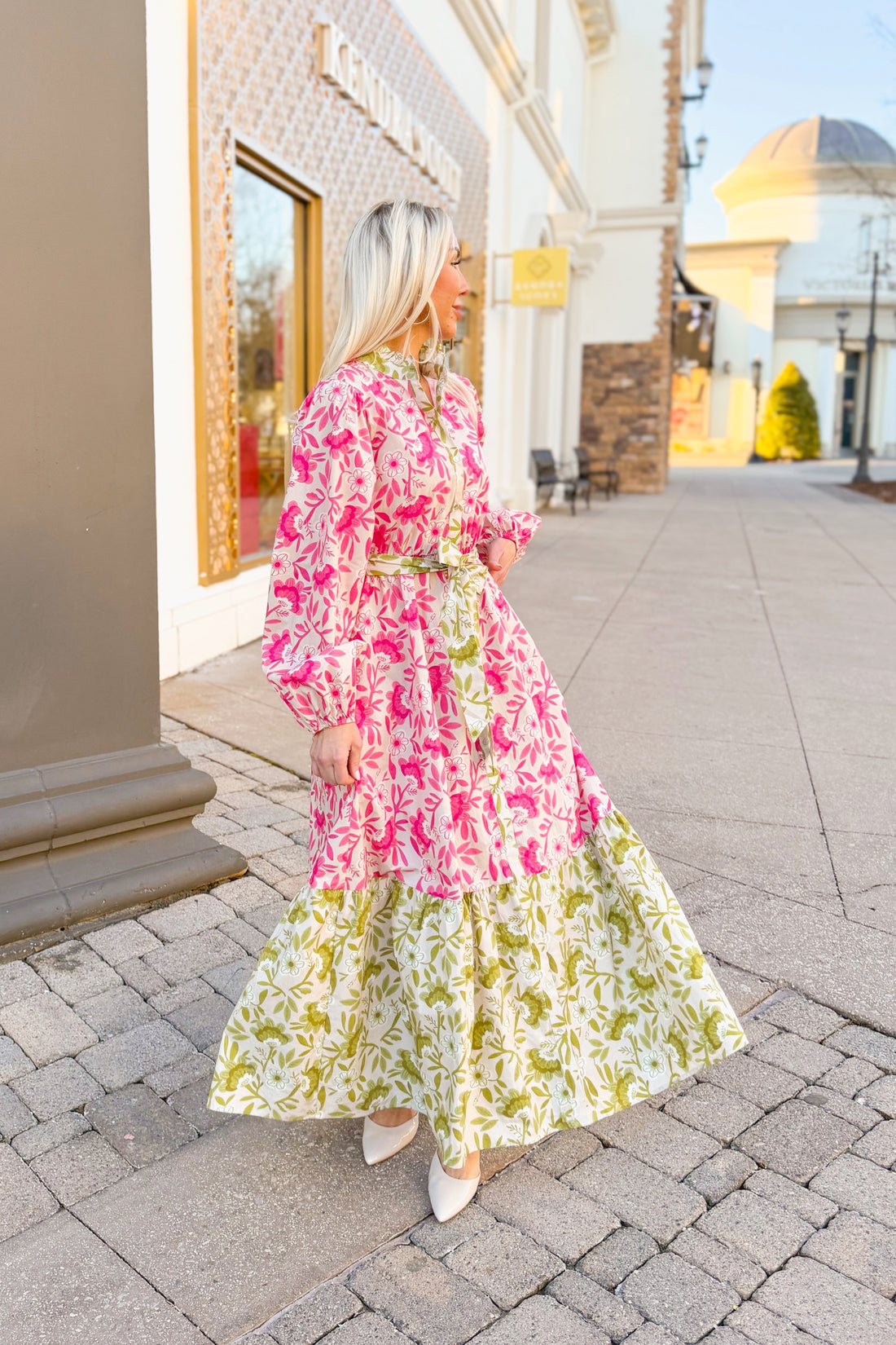 Pink and Green Floral Long Sleeve Maxi Dress