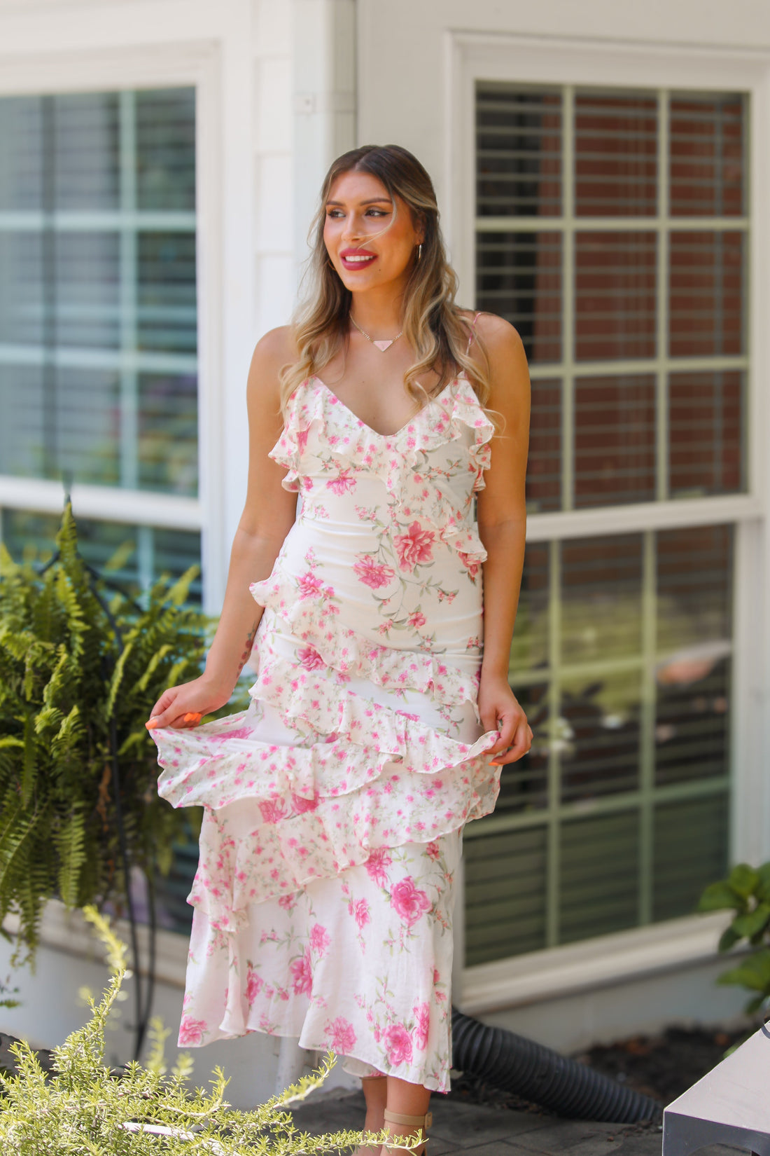 White and Pink Floral Ruffle Maxi Dress
