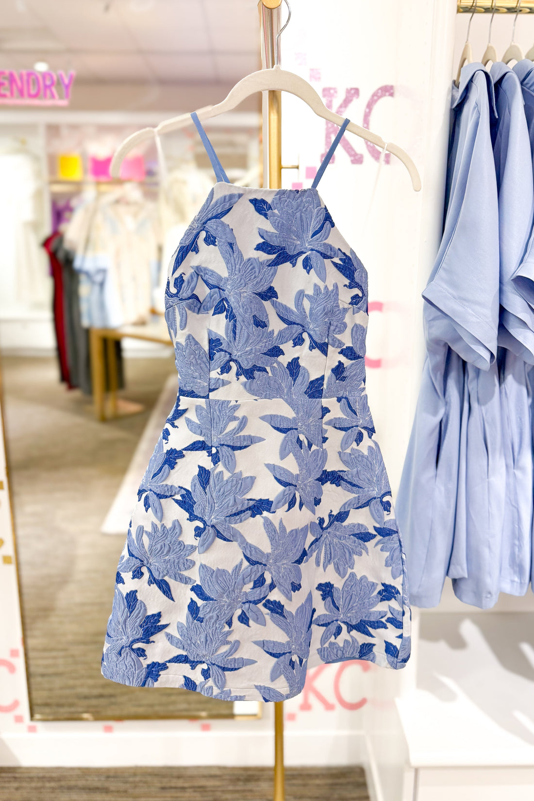Blue Jacquard Floral High Neck Mini Dress