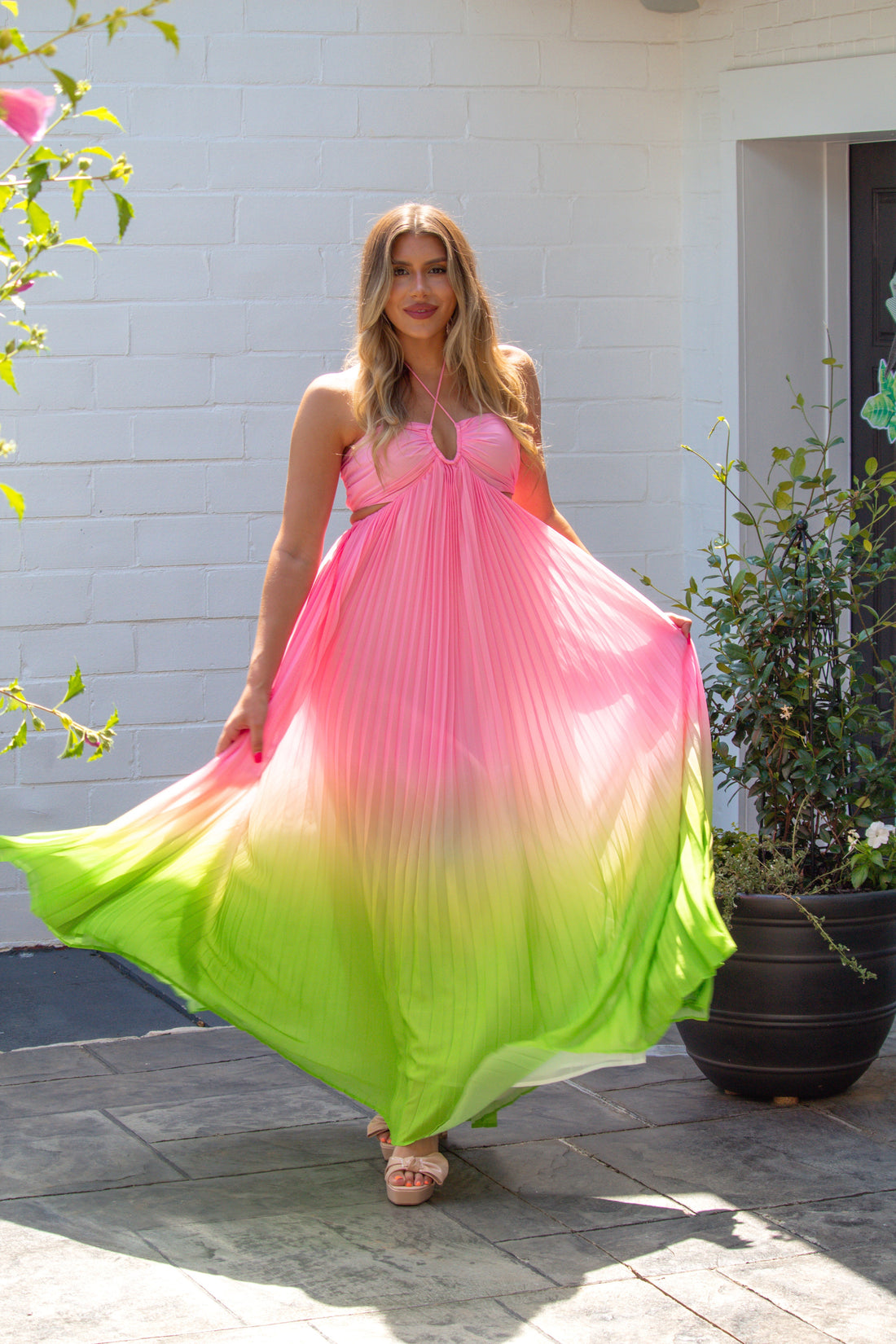Pink and Green Ombre Pleated Halter Maxi Dress