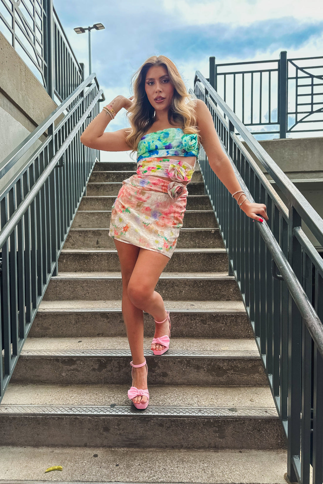 Multi Color Floral Jacquard Cut Out Rosette Mini Dress