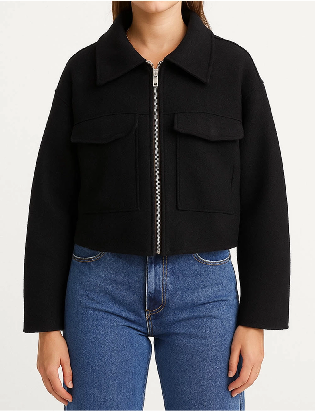 Cropped Wool Blend Jacket, Black