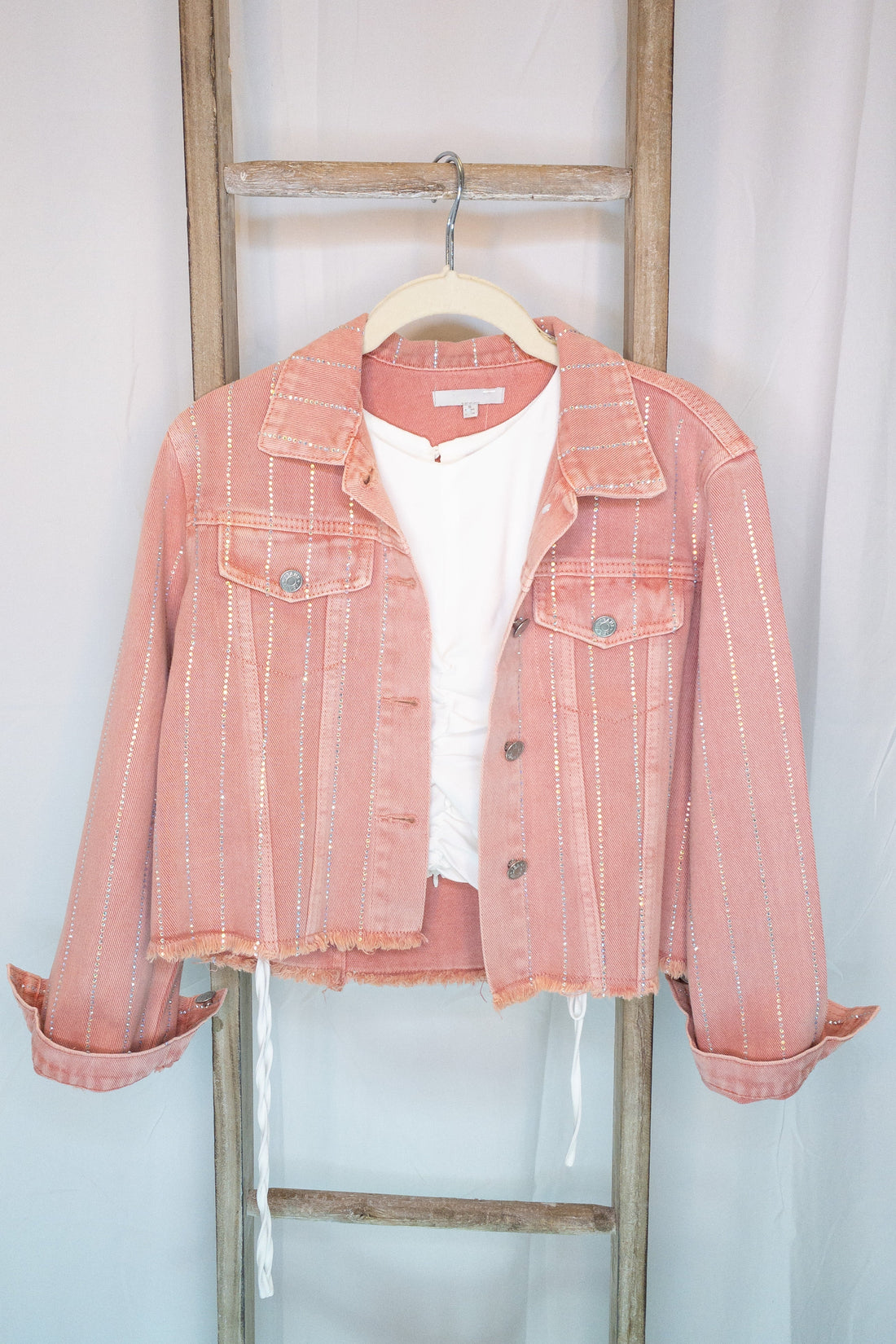 Pink Kyler Rhinestone Raw Hem Denim Jacket