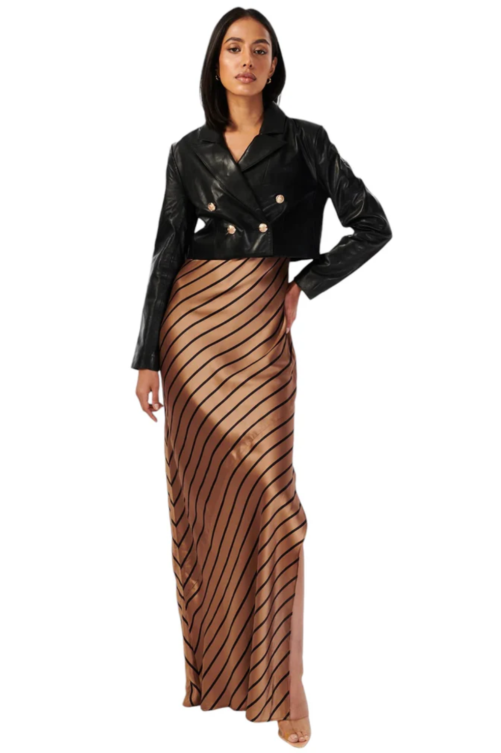 The "Boa Jacket" from Cami NYC is a cropped, boxy double-breasted blazer and is made from genuine leather that features gold crest buttons on the front and sleeves. Designed with shoulder pads for added structure, it is fully lined for comfort. True to size.