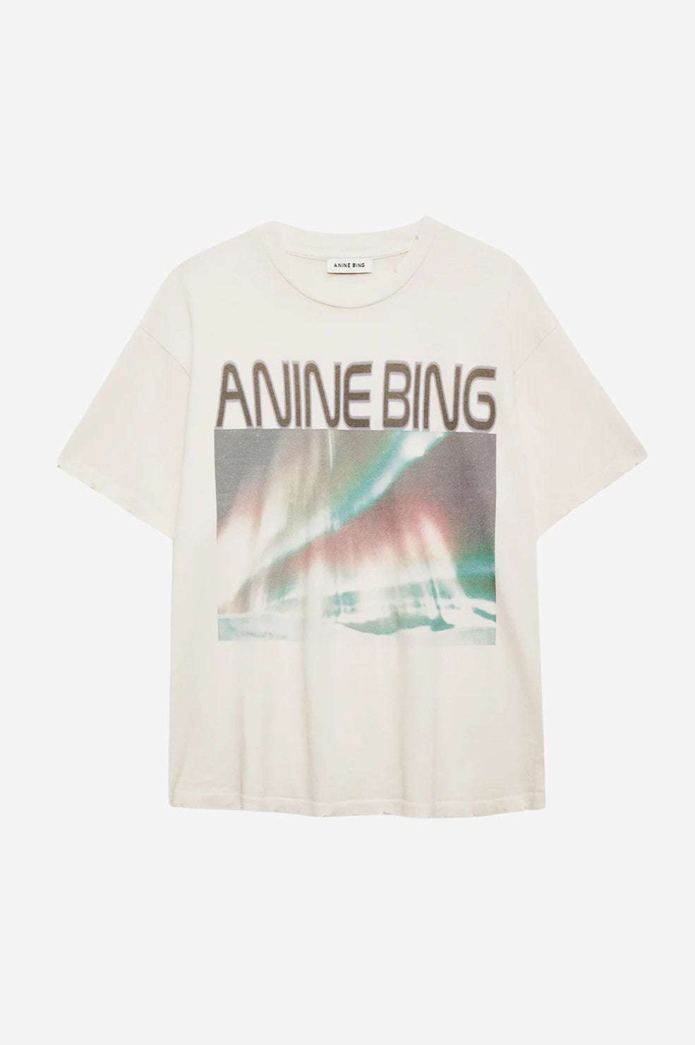 The "Cade Tee" from ANINE BING is a lightweight cotton jersey tee in a soft off-white wash. Featuring a loose, boxy silhouette and a digitally printed northern lights graphic, it¡¯s an easy everyday staple with a modern edge.