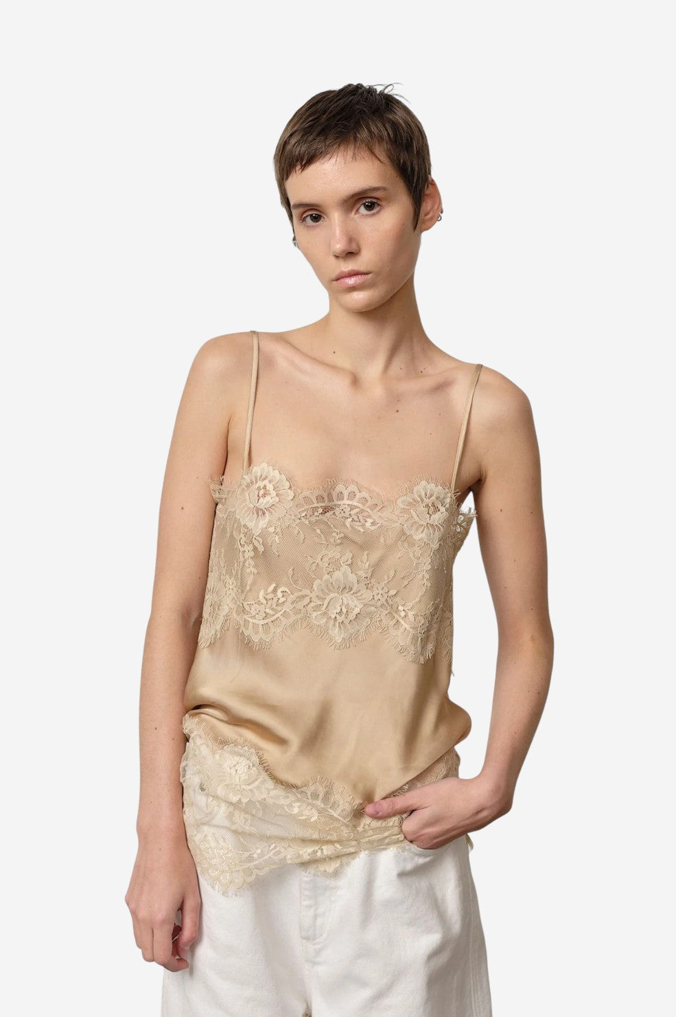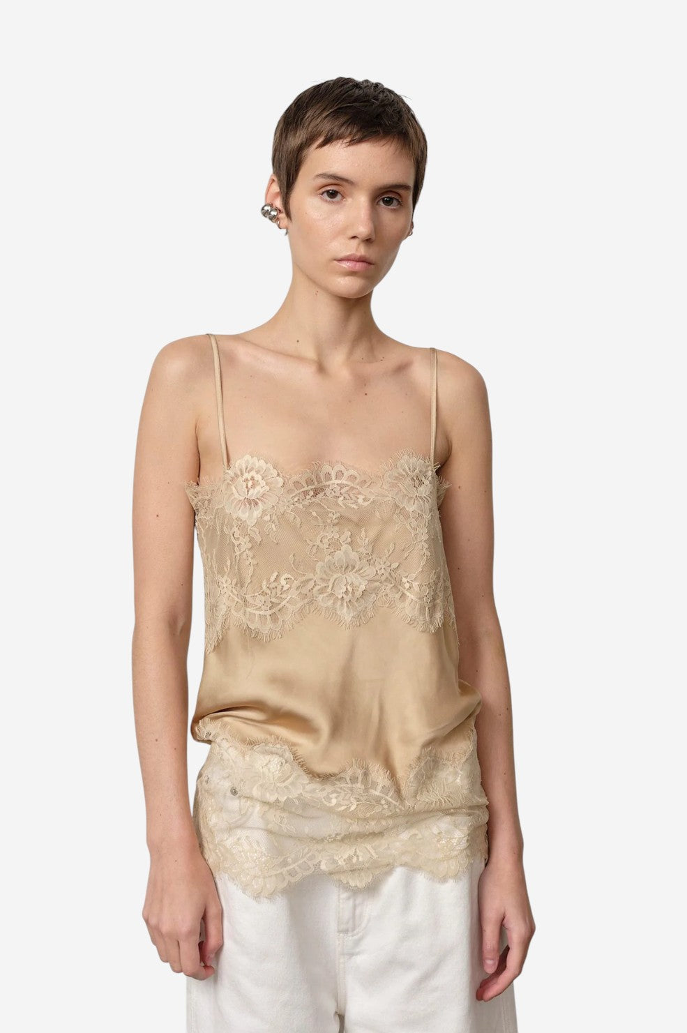 Slip into effortless elegance with the "Linnea Top" from Herskind. Cut from fluid satin with a delicate lace trim, this cami brings a touch of romance to any look. Spaghetti straps and a straight neckline keep the silhouette clean and versatile, perfect for layering or wearing solo.