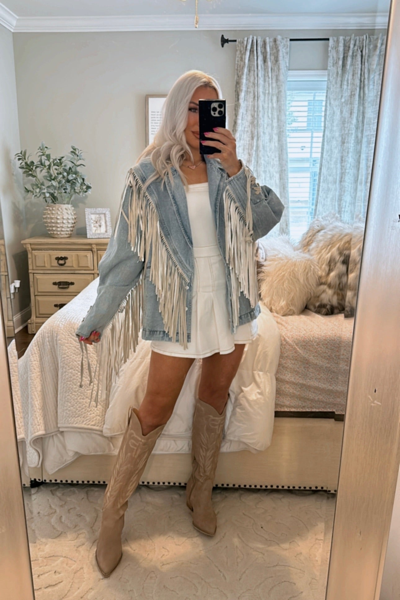 Get ready to rock the south in our Oversized Fringe Denim Jacket! This playful and edgy design will have you standing out in the Nashville crowd. With its oversized fit and trendy fringe detailing, you'll be the talk of the concert. Don't miss out on this must-have jacket for any music lover!
