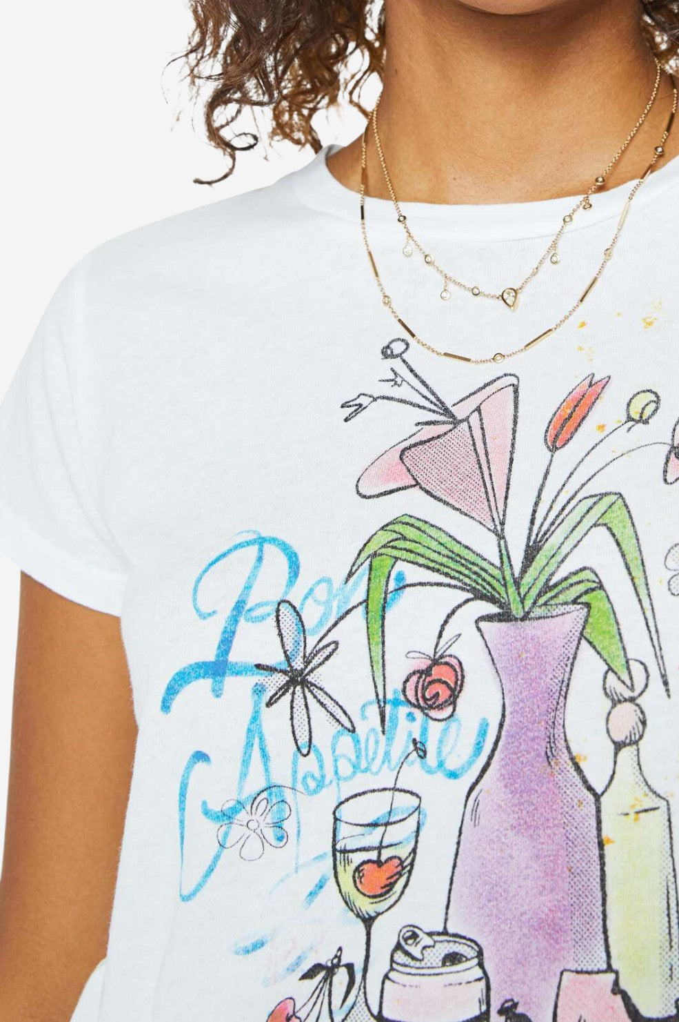 The "Boxy Goodie Goodie" from MOTHER brings a touch of nostalgia to your everyday tee rotation. Cut from soft, 100% cotton with a vintage-inspired slim fit, this crewneck feels lived-in from the first wear. A colorful, hand-drawn still life graphic and playful blue text add a punch of personality to the crisp white base¡ªmaking it the perfect companion to denim, trousers, or layered under a blazer for an unexpected twist.