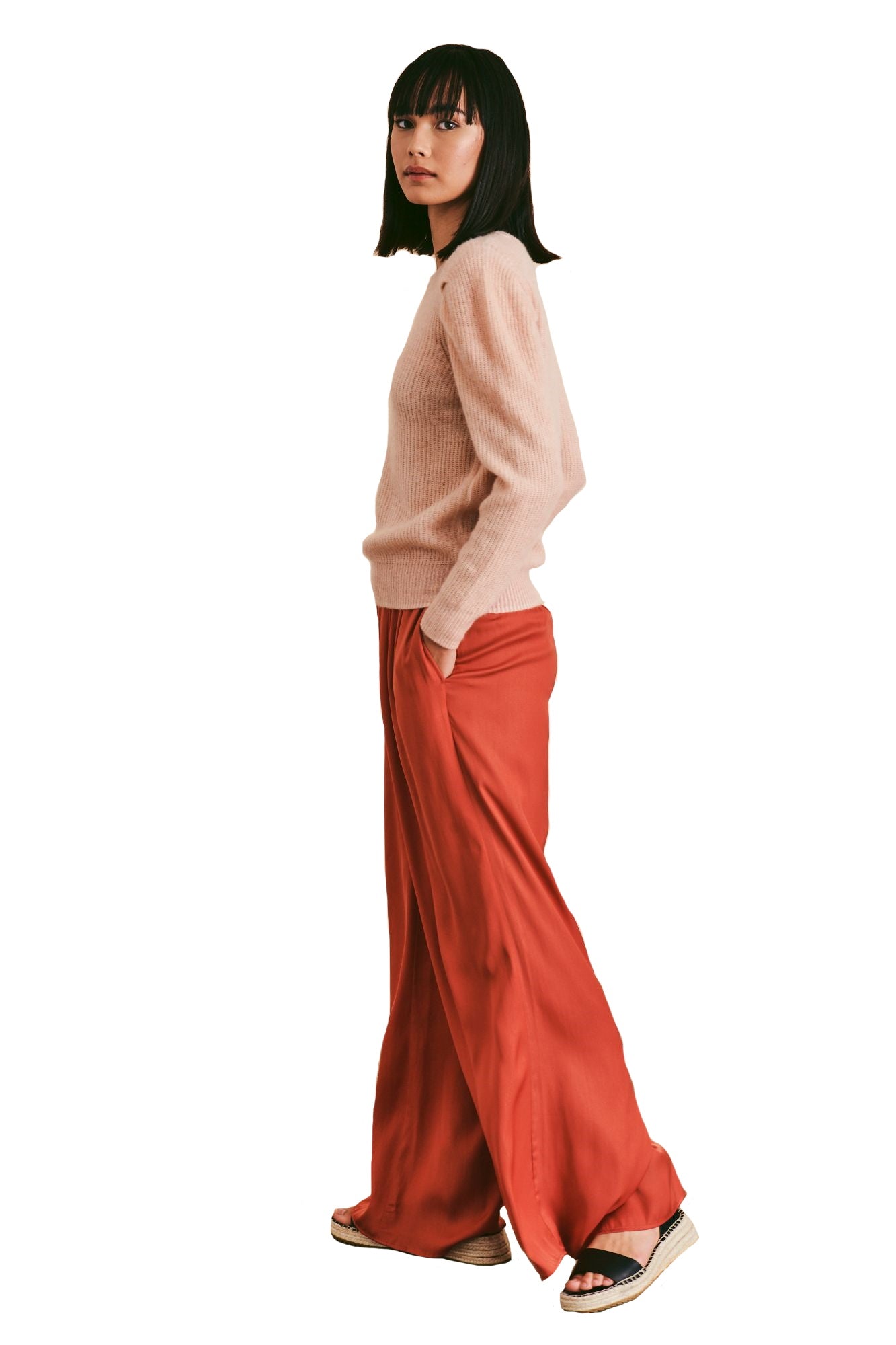 The "Talia Sweater" from Line the Label is a gorgeous cashmere sweater, featuring a puff shoulder detail and soft peach colorway.?