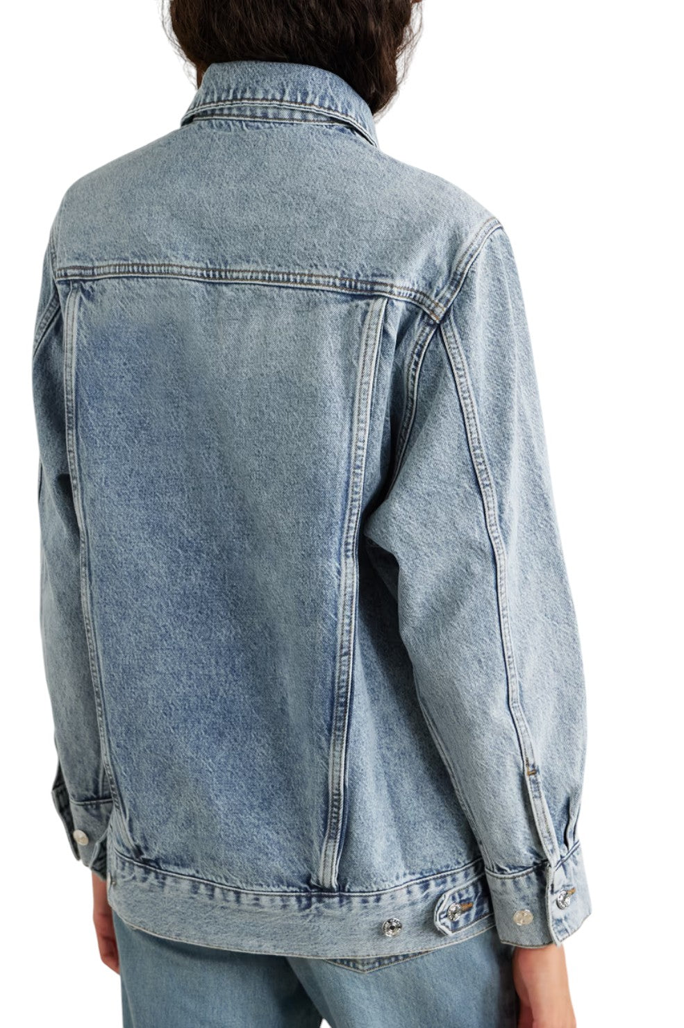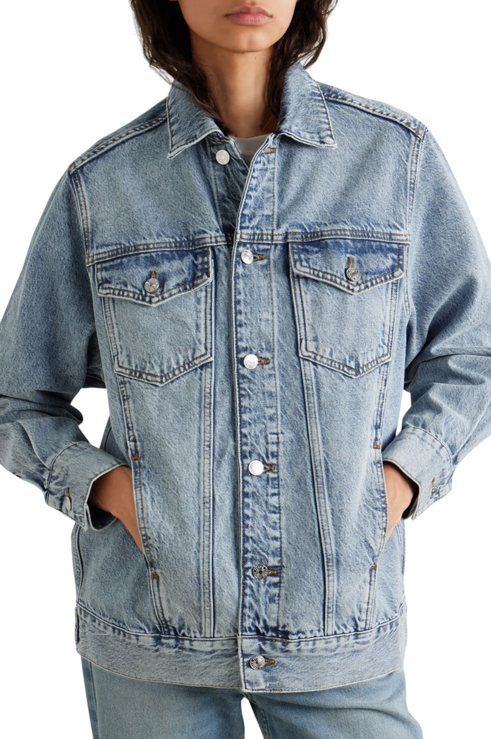 The "Extended Jacket" from Frame offers a relaxed, longline fit in light-blue denim with subtle fading. Featuring button fastenings and discreet seam pockets, it's made from 100% regenerative cotton, supporting sustainable farming practices that enhance soil health and reduce carbon emissions. Crafted with at least 50% lower-impact materials, this piece blends style with sustainability.